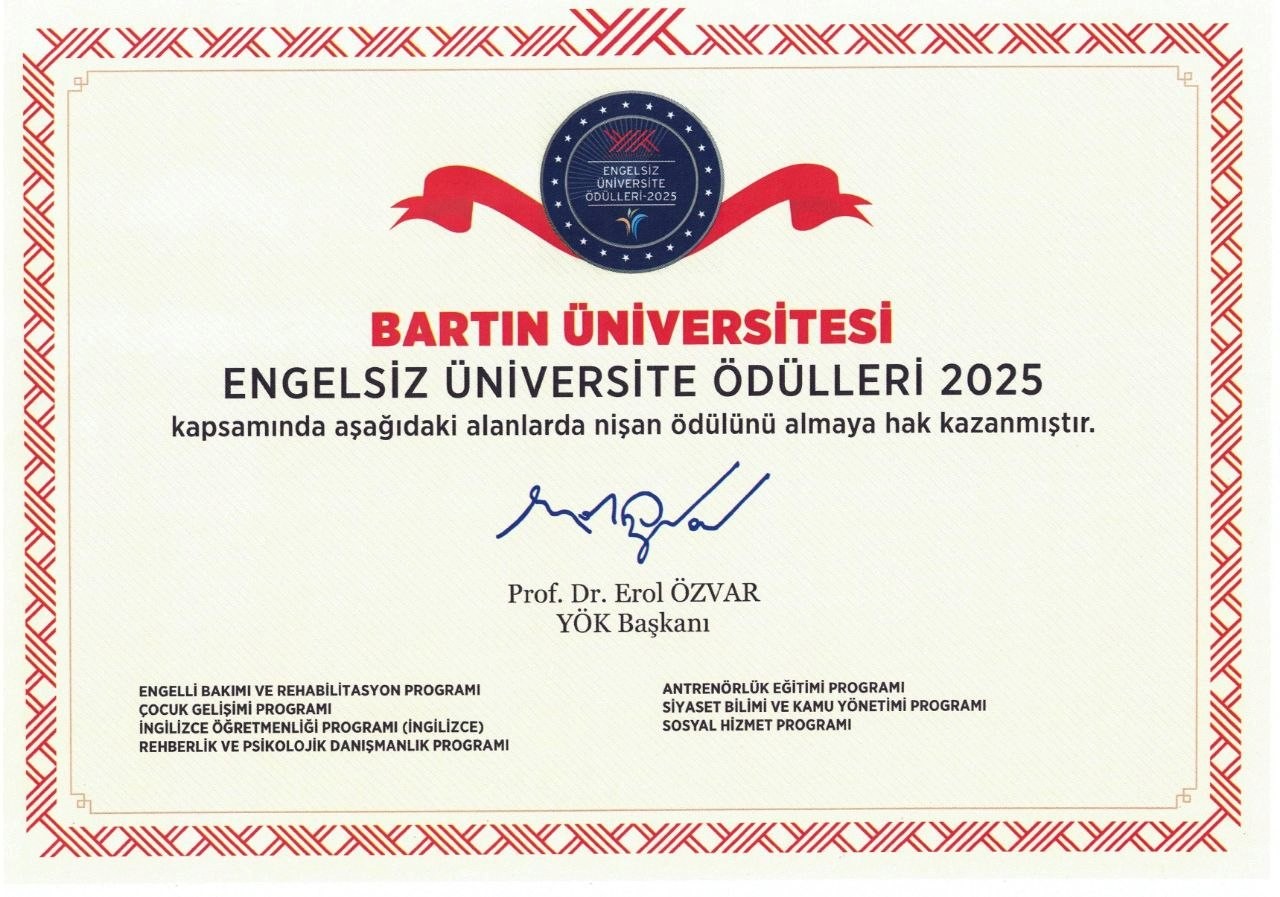 Bartın Üniversitesi (BARÜ), Yükseköğretim Kurulu (YÖK) tarafından düzenlenen “Engelsiz Üniversite Bayrakları ve Program Nişanı Ödül Töreni” kapsamında önemli bir başarıya daha imza attı. Sağlık Bilimleri Fakültesi Sosyal Hizmet Bölümü, erişilebilir ve kapsayıcı eğitim anlayışı doğrultusunda yürüttüğü çalışmalar sayesinde “Engelsiz Üniversite Program Nişanı” almaya hak kazandı.